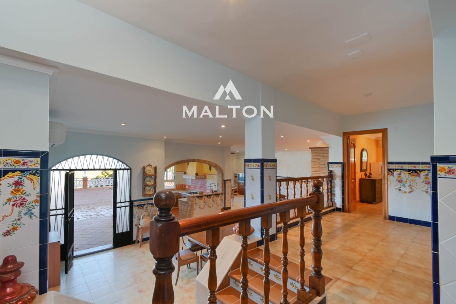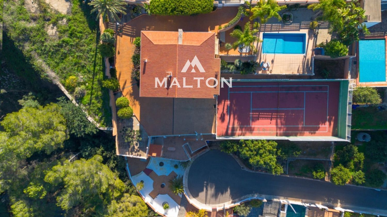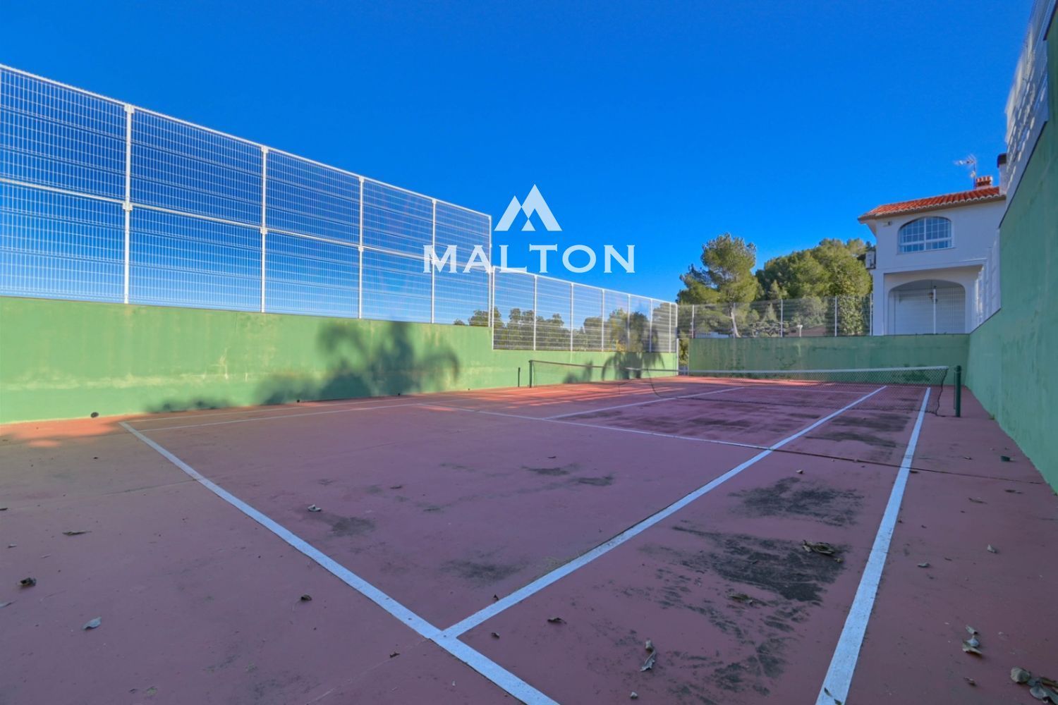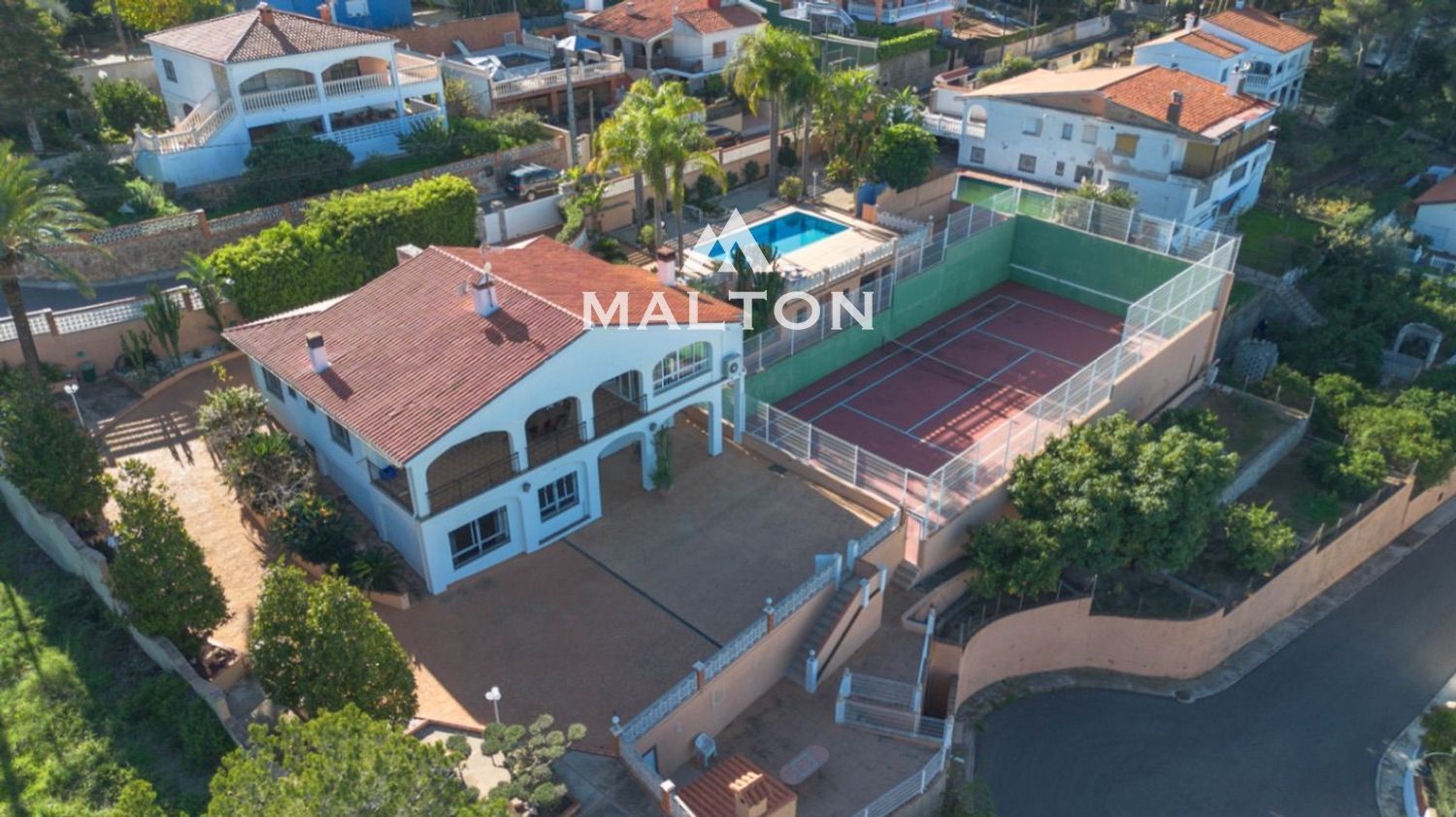 La vivienda principal queda distribuida en una sola planta, aumentando así su atractivo. Desde el distribuidor de la entrada, accedemos por un lado al amplio salón-comedor conectado con la cocina y con la preciosa terraza cubierta, y por el otro lado, a la zona de noche con tres dormitorios dobles con armarios empotrados y dos baños completos. Desde el salón parte una escalera interior que comunica la vivienda principal con la planta baja semi-diáfana que alberga un amplio salón a doble altura con chimenea y cocina abierta, un baño completo y tres dormitorios dobles teniendo uno de ellos un baño incorporado. Desde esta planta se accede a una grandísima terraza destinada en parte a aparcamiento, una pista de tenis, una zona de jardín de árboles frutales y la zona apartada de barbacoa exterior-paellero que se comunica con otra calle mediante acceso peatonal.